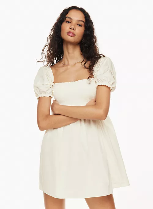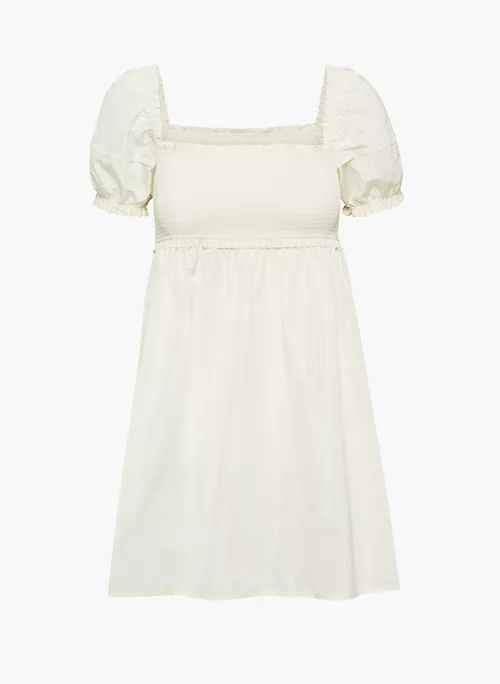 This is a babydoll mini dress with a square neckline, puff sleeves and a smocked bodice. It’s made from silky smooth taffeta with a structured feel and lustrous sheen. Itās sourced from a premier Italian mill.