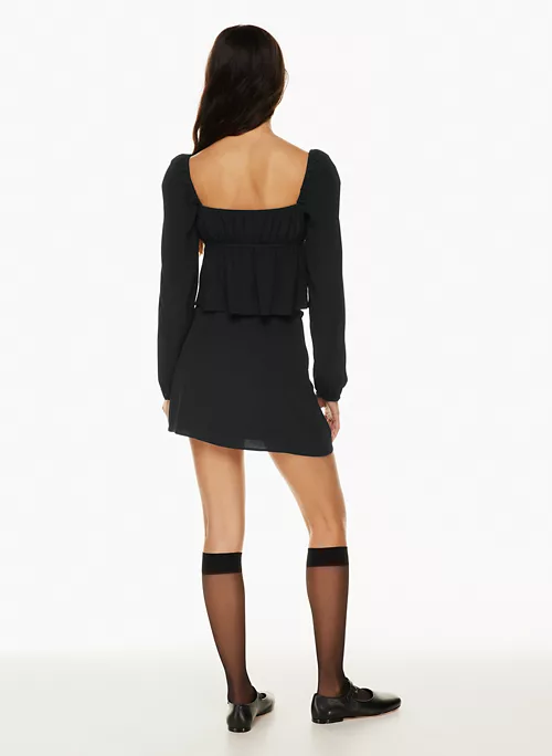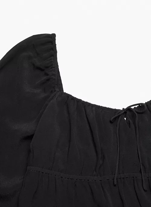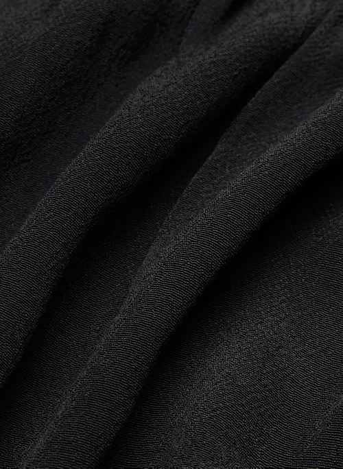 This is a babydoll blouse with a ruched bust and a self-tie detail. It’s cut from drapey crepe fabric with a subtle pebbled texture.