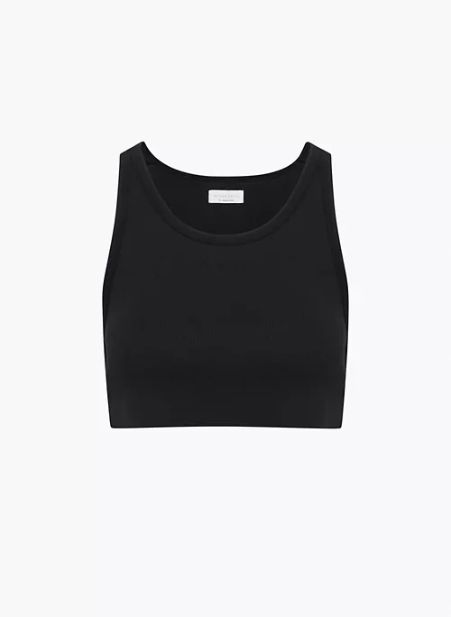 This is a cropped scoop-neck tank with a raw hem. It’s made from soft 100% cotton rib.