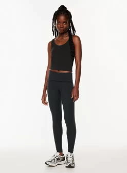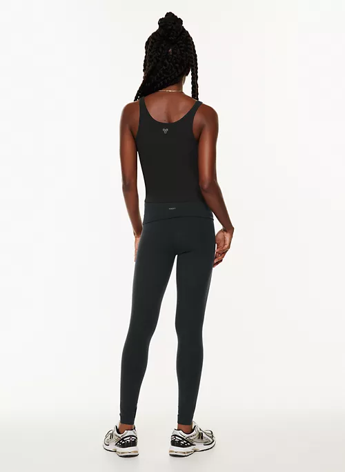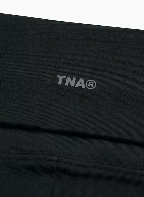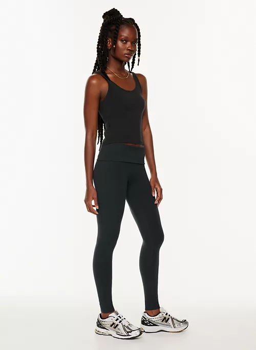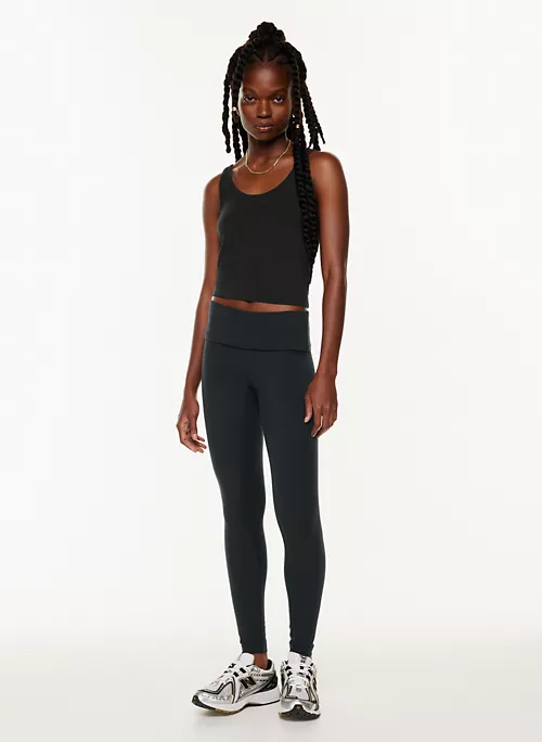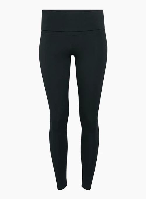 These are mid-rise leggings with a fold-over waistband. They’re made with Hold-It™ — ultra-soft stretch jersey that holds its shape while defining yours. Clutch.