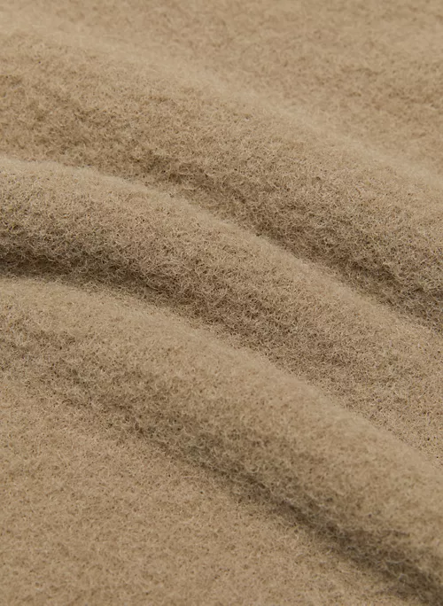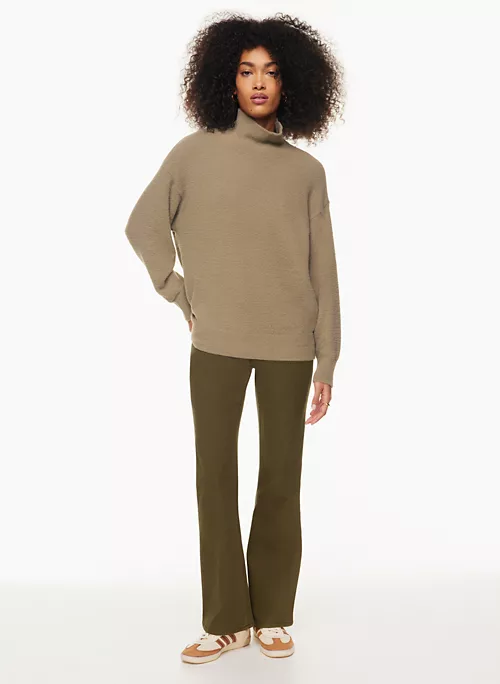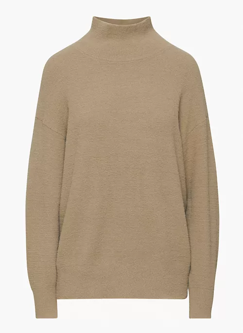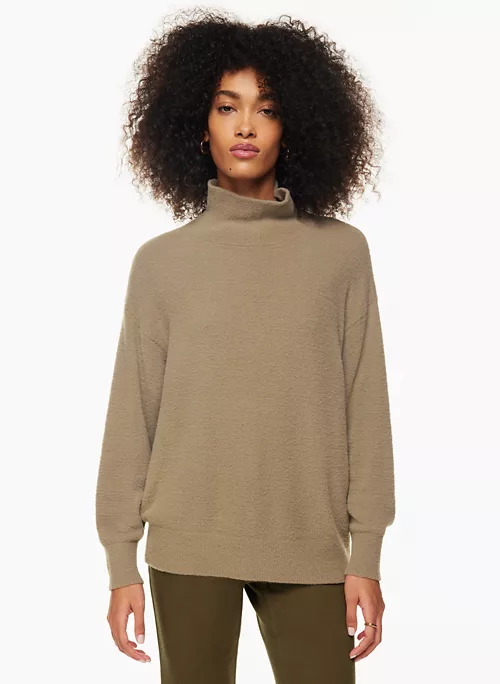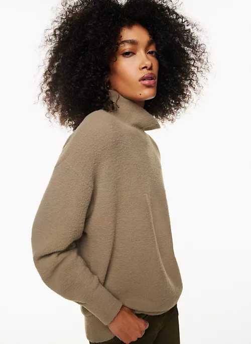 This is a turtleneck sweater with dropped shoulders and fully fashioned construction. Itās made with Wilfred Freeās Hush Knit ā plush, cuddly soft chenille from Italy. It’s constructed using a Jersey stitch for a soft drape and a smooth, flat feel.