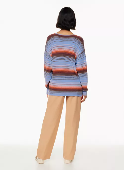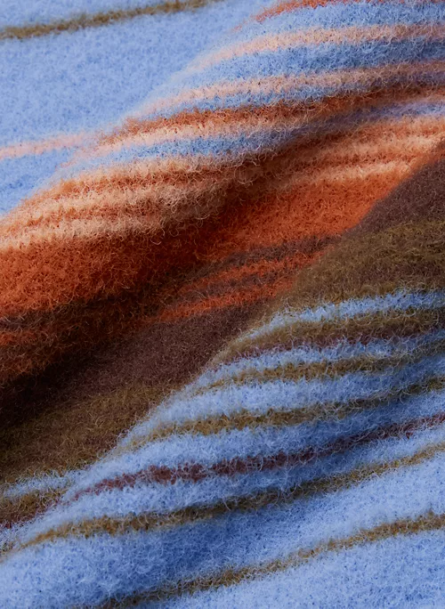 This is a fully fashioned V-neck sweater with dropped shoulders. Itās knit with Wilfred Freeās Hush ā plush, cuddly soft chenille yarn from Italy. This version comes in a yarn-dyed stripe pattern that’s been woven in, as opposed to printed on, for a more dimensional look.