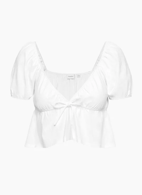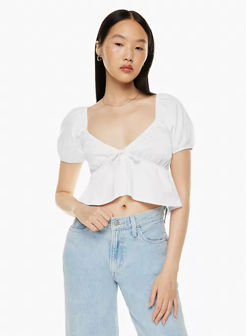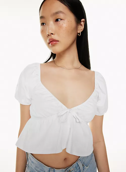 This a tie-front top with puff sleeves and a peplum hem. It’s made with soft 100% cotton jersey.