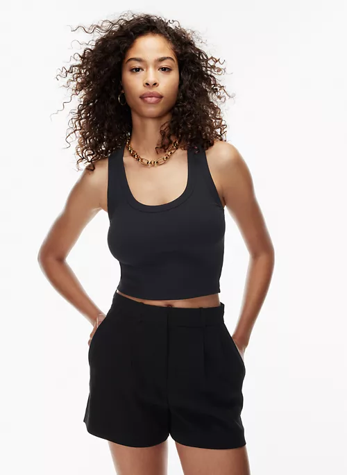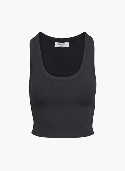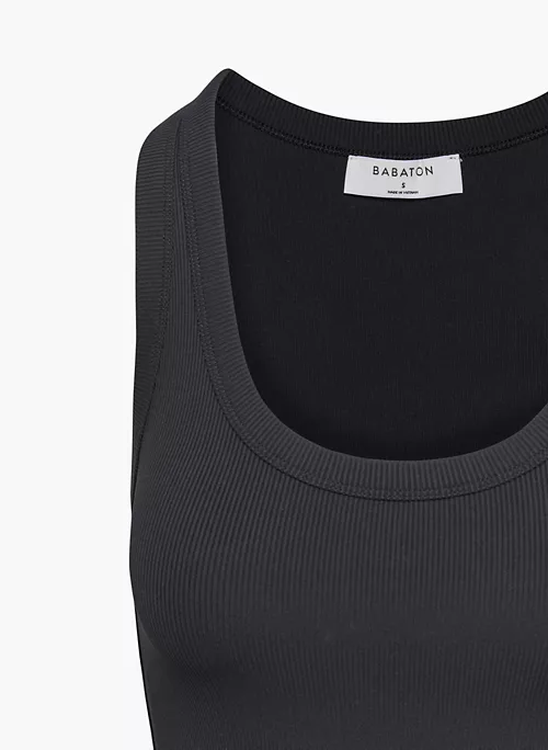 This is a scoop-neck sleeveless tank. It’s made with FormaRib ā a luxe, high-stretch fabric with a second-skin feel and ribbed texture.