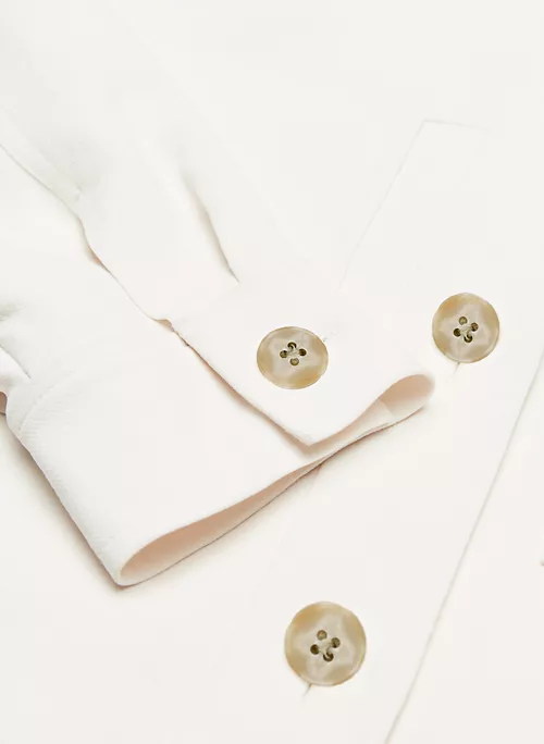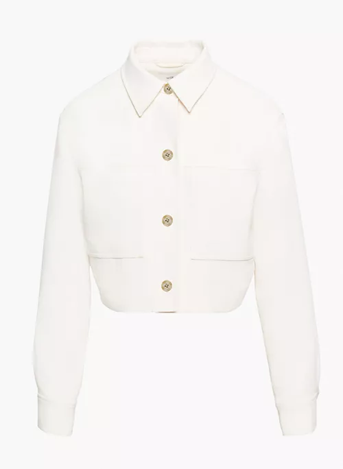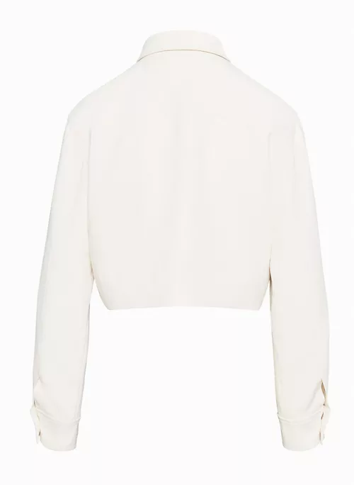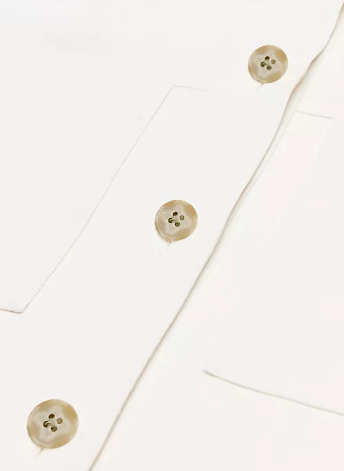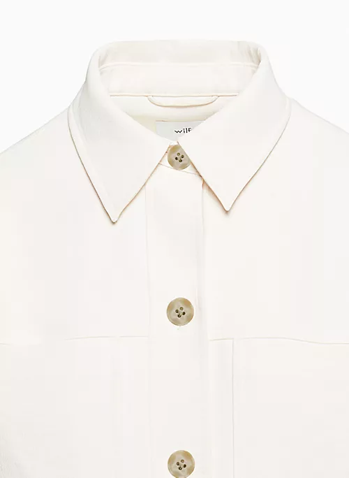 It’s still a jacket. Specifically, it’s a perfect little button-up jacket with chest pockets and a hem that hits just right. Itās made from Crepette⢠ā Wilfredās iconic crepe fabric famous for its subtle texture and breezy, effortless drape. This fabric is sourced from an innovative Japanese mill.Ā Ā