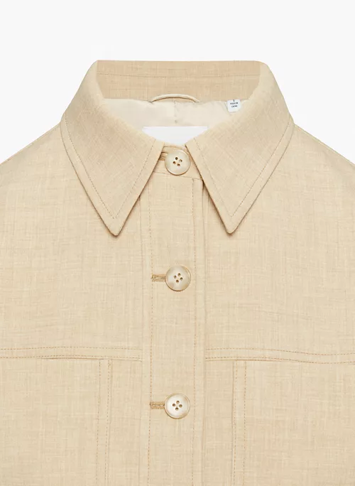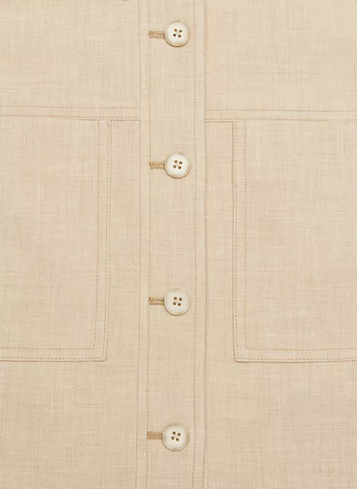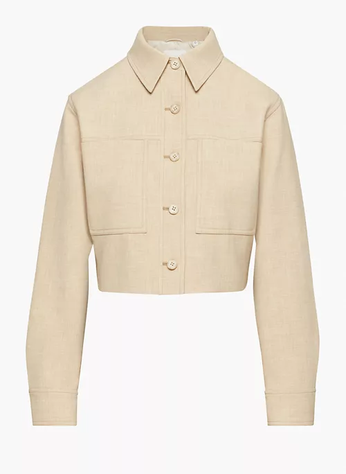 It’s still a jacket. Specifically, it’s a perfect little button-up jacket with chest pockets and a hem that hits just right. It’s made with (Re)ssential — softly structured stretch fabric that holds its form while you move easy. This fabric is sourced from a premier Portuguese mill and made with recycled materials and LENZING™ ECOVERO™ Viscose — responsibly sourced, wood-based fibres produced through a process that reduces impact on forests, biodiversity and water supply.