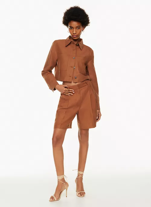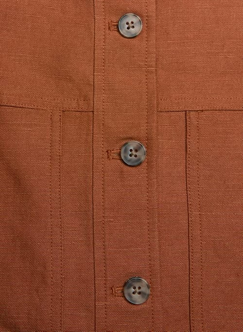 It’s still a jacket. This is a fully-lined button-up jacket with chest pockets. It’s cut from soft, drapey fabric made with linen and TENCEL™ Lyocell — responsibly sourced wood-based fibres produced through a closed-loop system that reduces environmental impact.