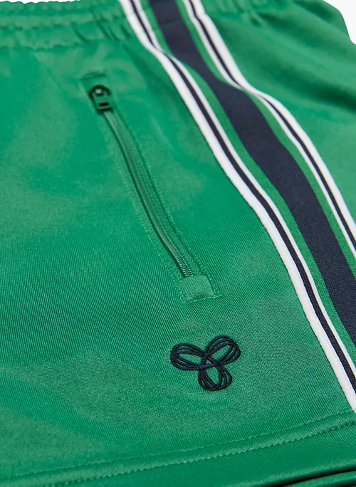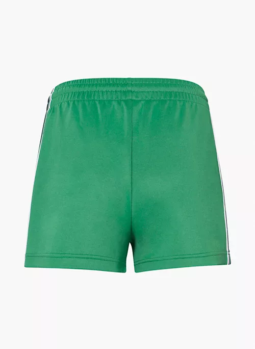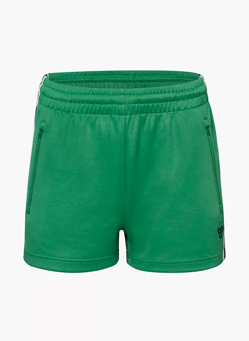 These are mid-rise track shorts with an elastic waistband and hand pockets. They’re made with soft, stretchy interlock fabric.