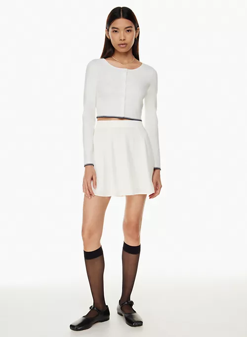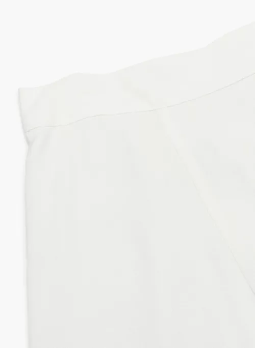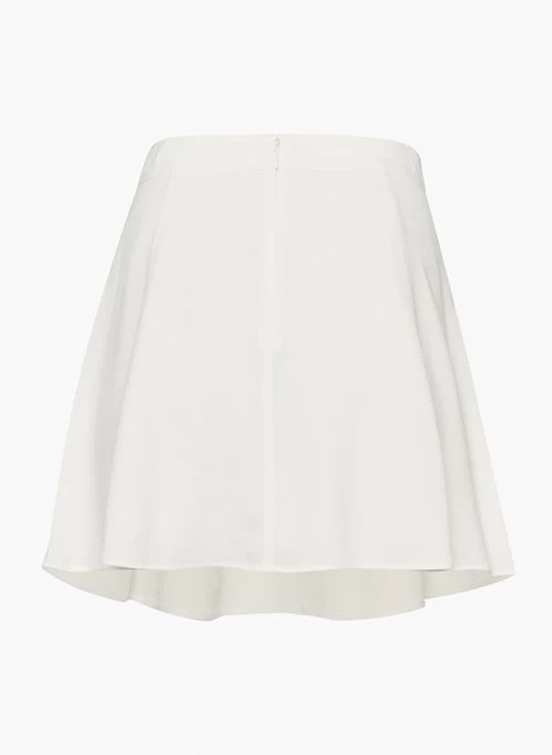 This is a high-rise A-line mini skirt with an invisible back zip. It’s made from lightweight, drapey crepe fabric.