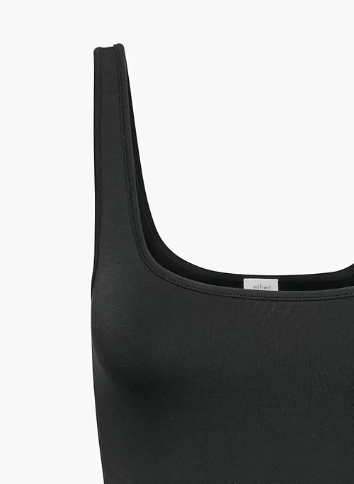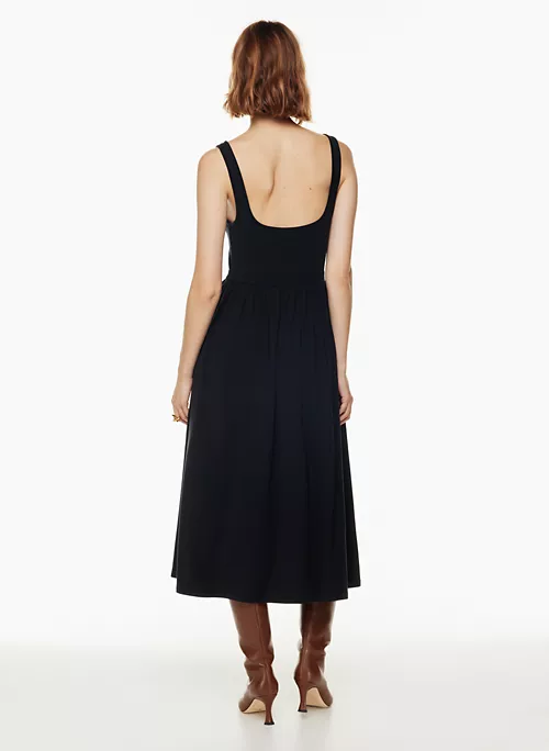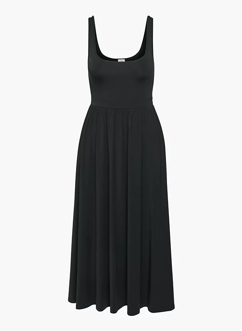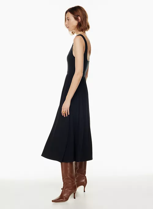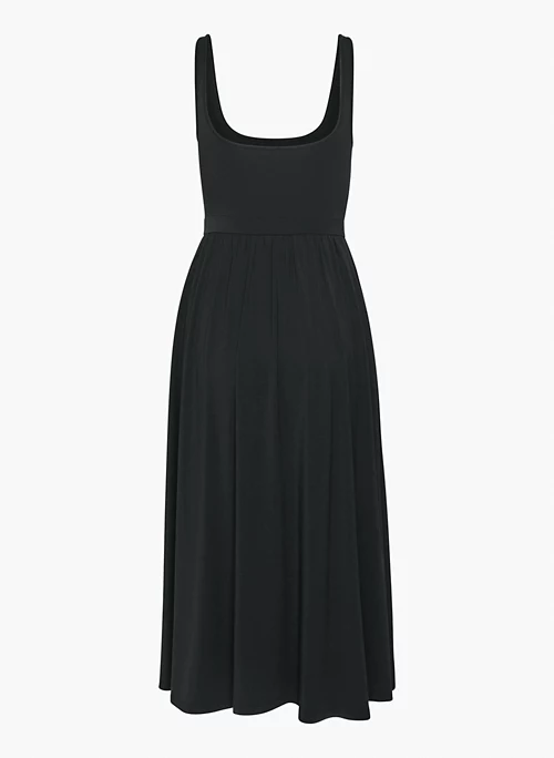 This is a square-neck, A-line midi dress with inseam pockets. It’s made with Relux Jersey, an ultra-soft and drapey fabric that uses TENCEL™ Lyocell — responsibly sourced wood-based fibres produced through a closed-loop system that reduces environmental impact.