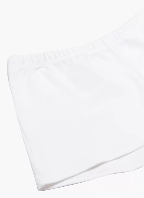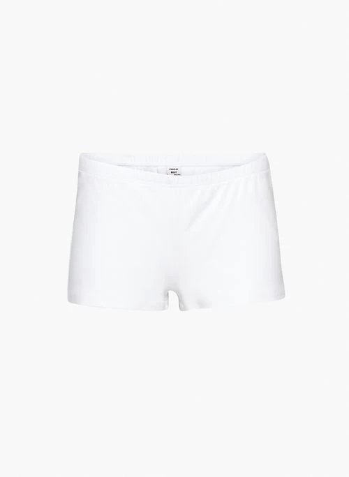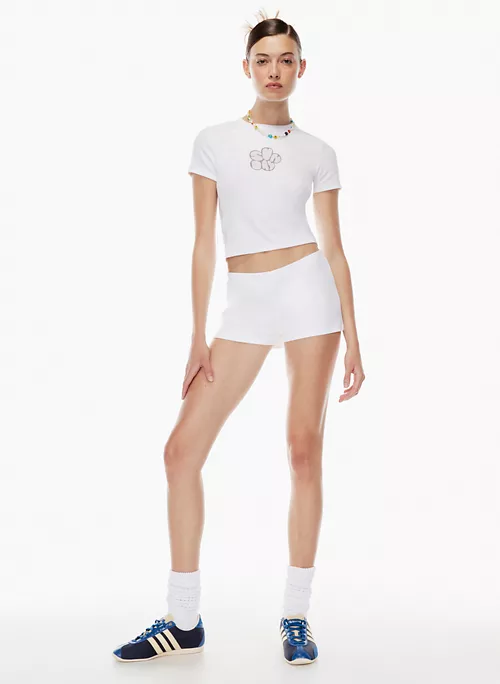 These are low-rise, pull-on shorts with an elastic waistband. They’re made with a soft cotton blend with slight stretch.