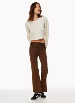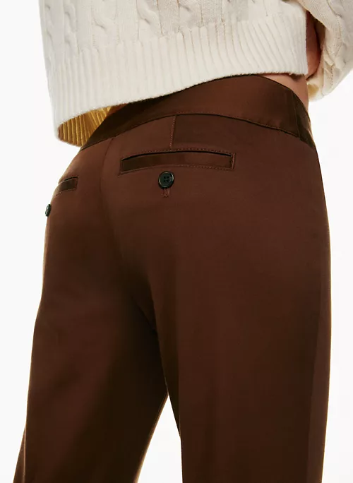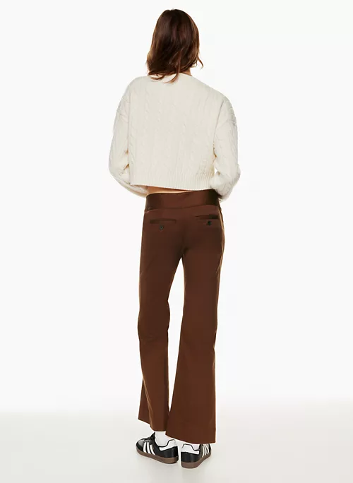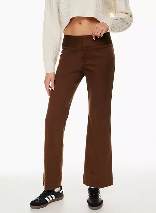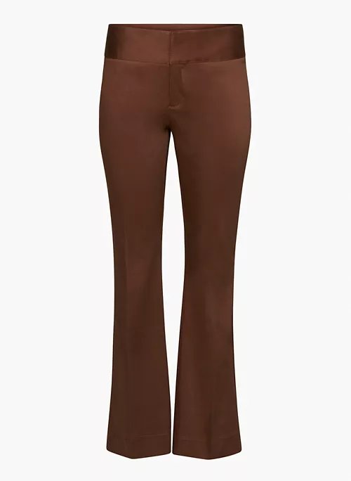 These are low-rise pants with a flared leg and back welt pockets. They’re cut from comfortable, stretchy Japanese fabric with a subtle sheen.