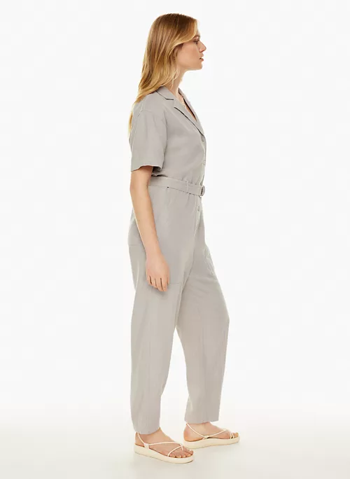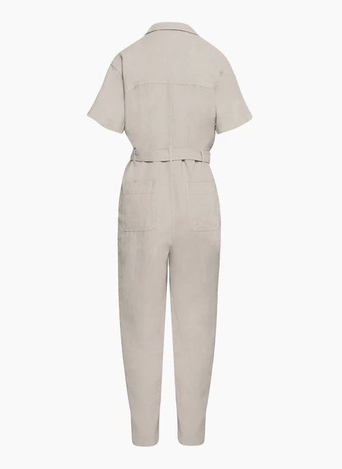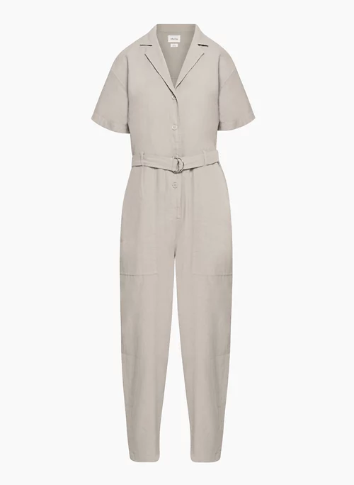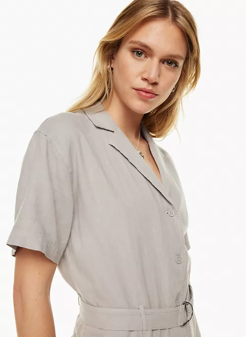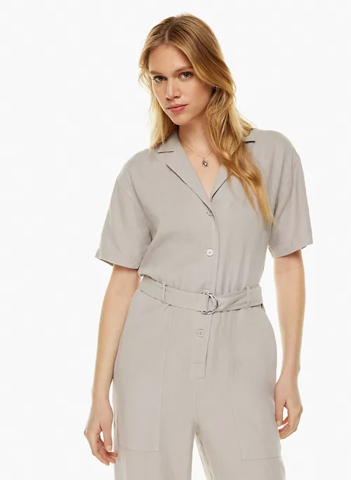This is a short-sleeve button-up jumpsuit with a relaxed fit. It’s made with airy linen and LENZING™ ECOVERO™ Viscose — responsibly sourced wood-based fibres produced through a process that reduces impact on forests, biodiversity and water supply.