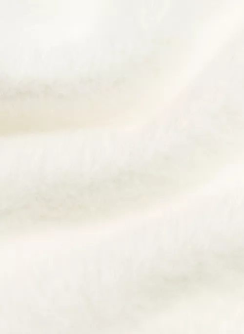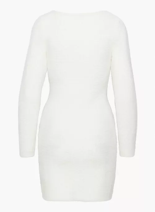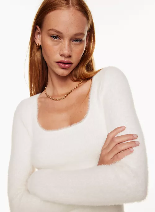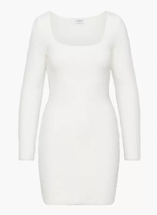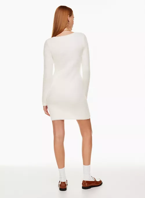 This is a square-neck sweater dress with fully fashioned construction. It’s made with a blend of our ultra-plush Fuzzy-Knit yarn and LENZING⢠ECOVERO⢠Viscose ā responsibly sourced wood-based fibres produced through a process that reduces impact on forests, biodiversity and water supply. It’s constructed using a Double Jersey stitch for structure and a flat, dense feel.