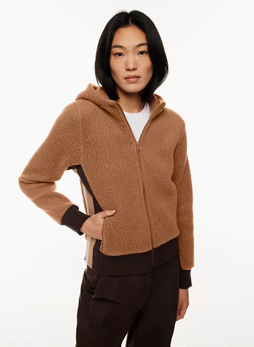 This is a hooded zip-up with pockets and ribbed finishing. It’s made with Bigfoot Polar — lightweight, 100% recycled fleece made with Polartec© Thermal Pro® that’s breathable and warm with a shaggy sherpa texture.