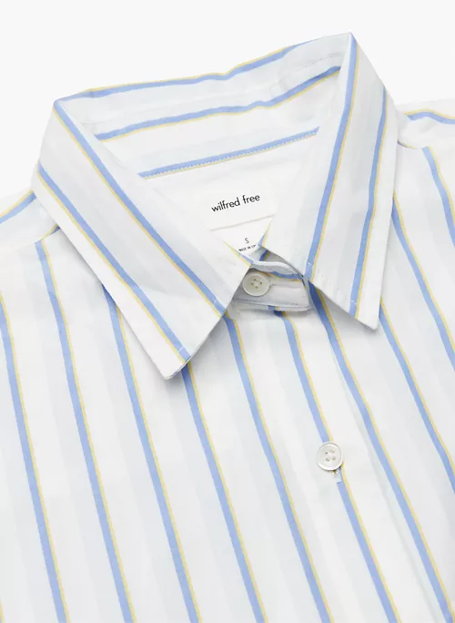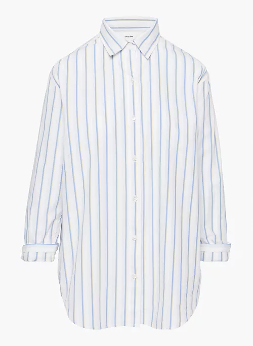 This is a menswear-inspired button up with a relaxed silhouette, dropped shoulders and a flattering rounded hem. It’s made from lightweight, airy 100% organic cotton with a crisp, smooth feel. This version features stripes that have been woven in as opposed to dyed for a more dimensional look.