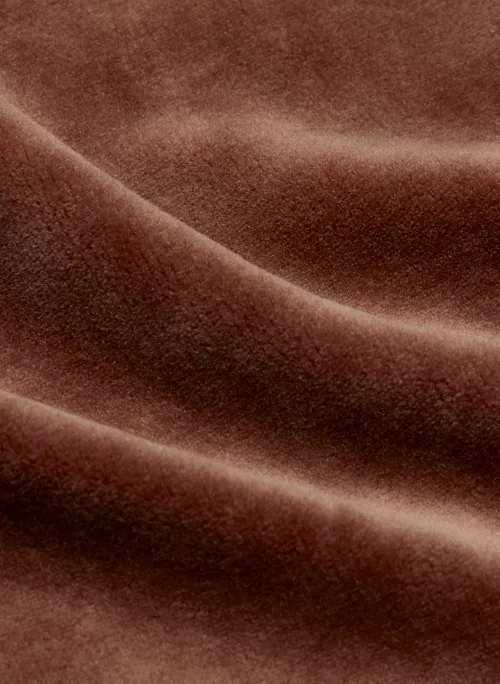 This is a shrunken zip-up hoodie with a kanga pocket and ribbed trim. It’s made with a plush, textural velour.Â