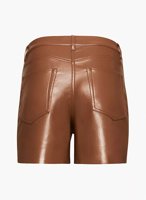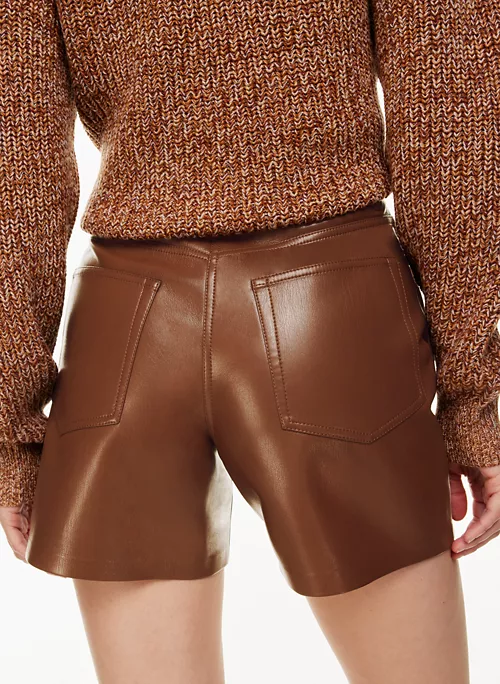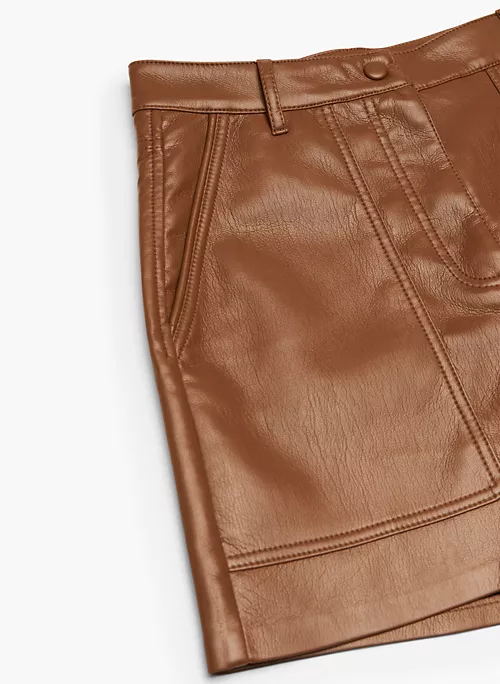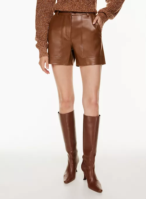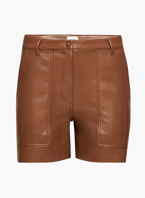 These are high-waisted utility shorts with patch hand pockets and topstitch detailing throughout. They’re made with our innovative Vegan Leather that looks and feels like the real thing.