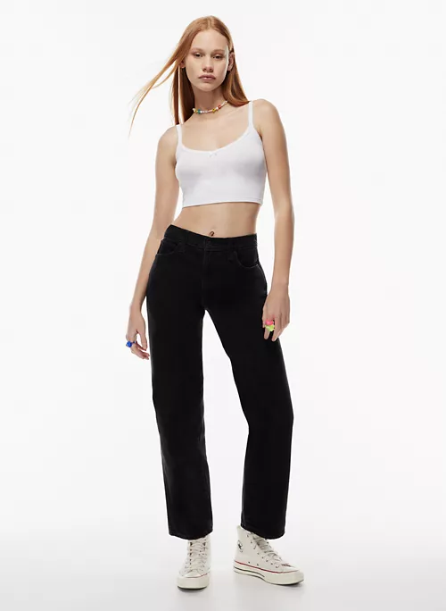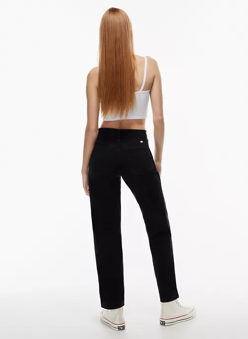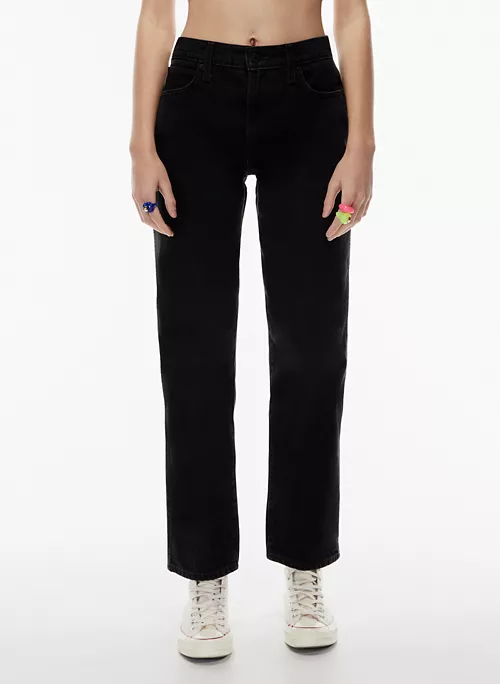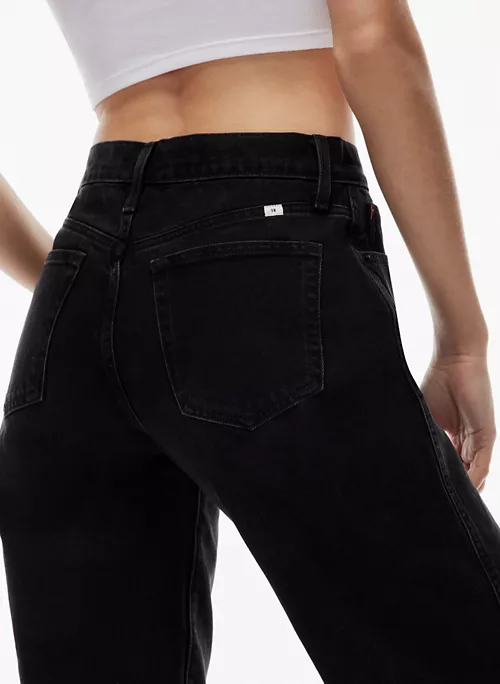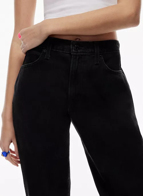 These are ’90s-inspired, mid-rise baggy jeans. They’re made of 100% cotton fabric that only gets better with time. This version comes in a true black wash and has a clean hem.