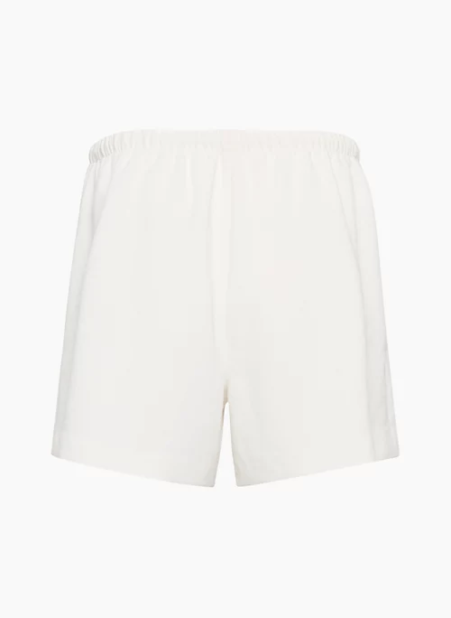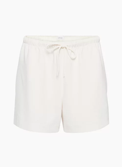 These are mid-rise shorts with an elastic waist and drawcord. They’re made from Crepette™ — Wilfred’s iconic crepe fabric famous for its subtle texture and breezy, effortless drape. It’s sourced from an innovative Japanese mill.