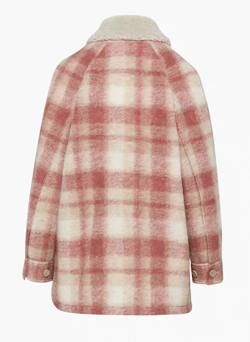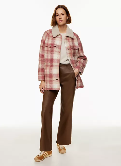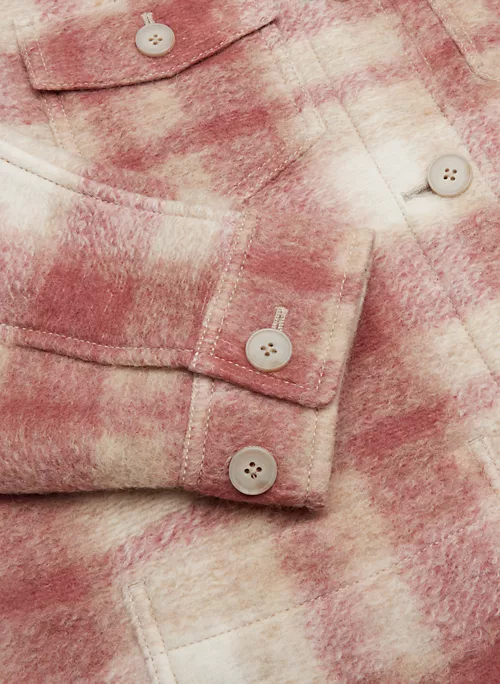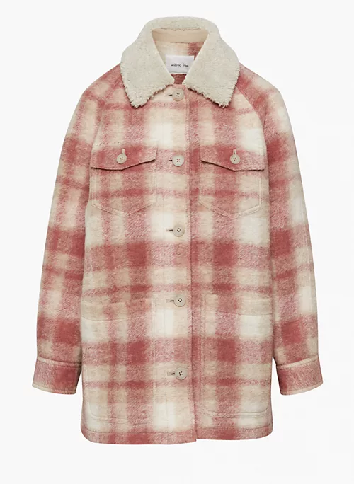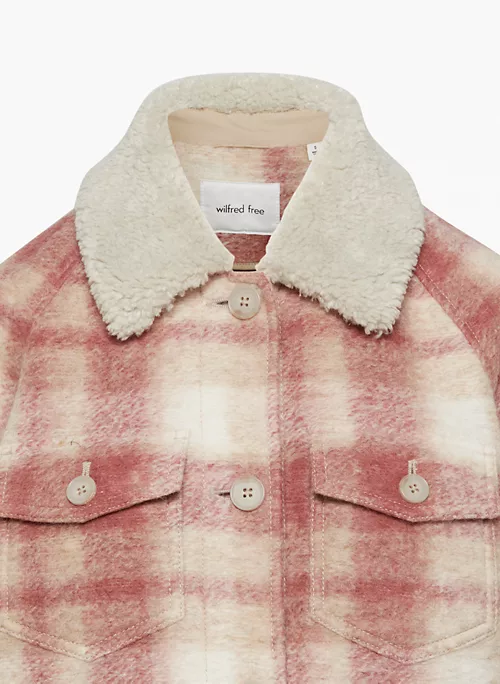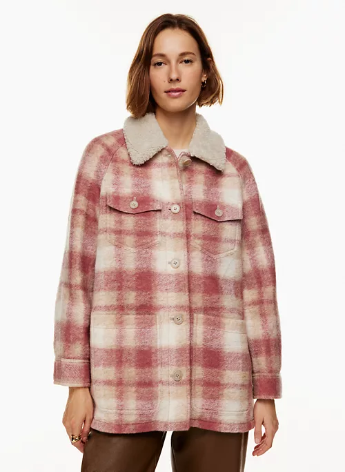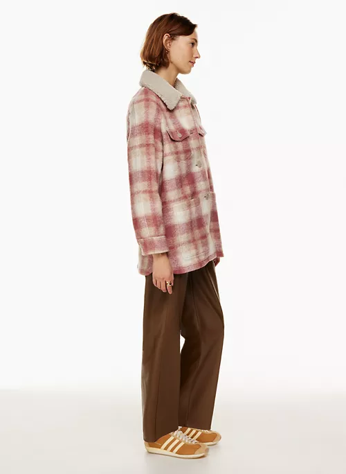 This is a utility-inspired button-up shirt jacket with a sherpa collar and patch pockets. It’s crafted with warm, luxurious felted Italian wool with a soft and cozy feel. It comes in a yarn-dyed plaid pattern that’s been woven in, as opposed to printed on, for a more dimensional look.