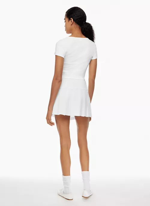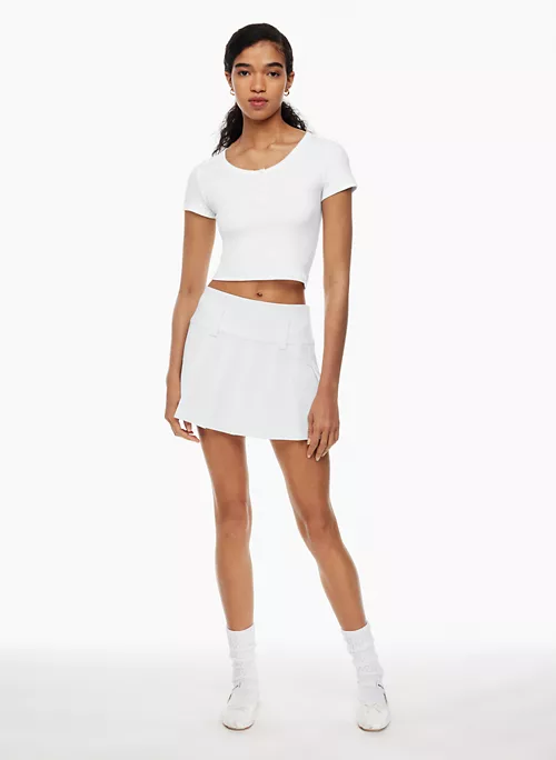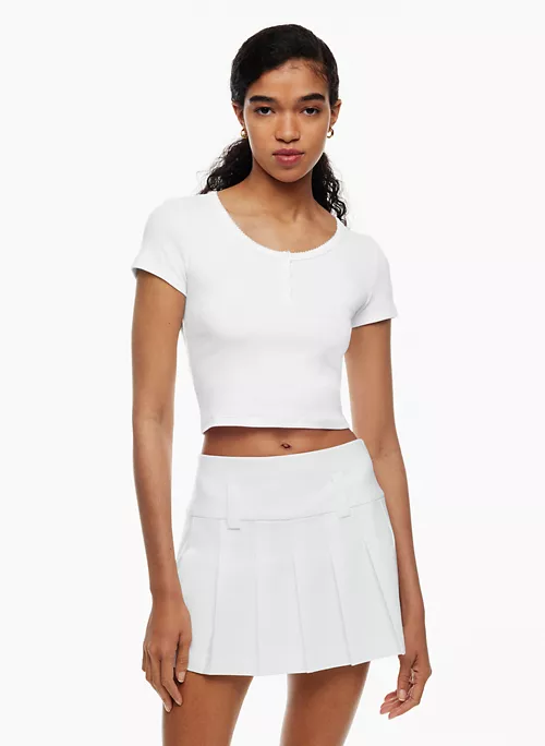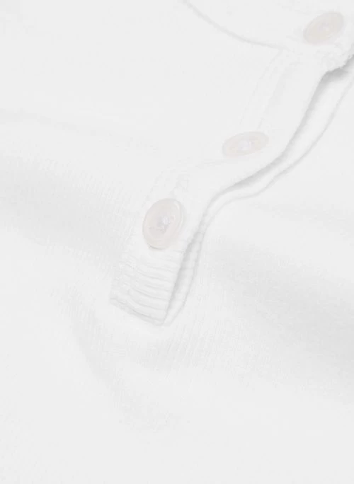 This is a henley t-shirt with a scoop neckline. It’s made with soft ribbed cotton that embraces the body.