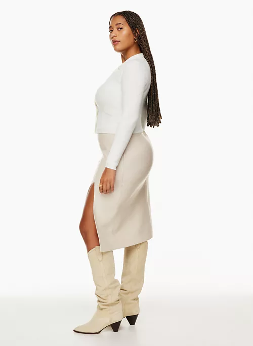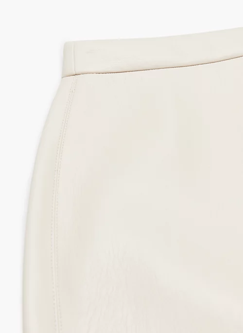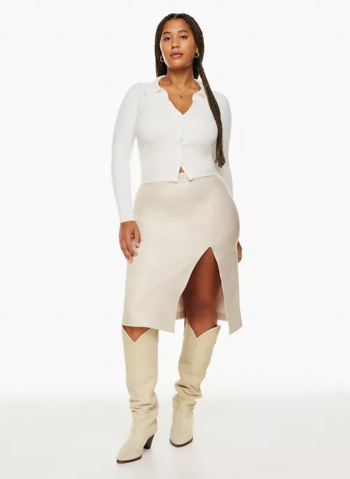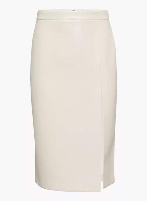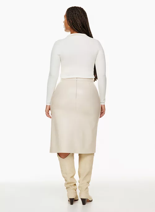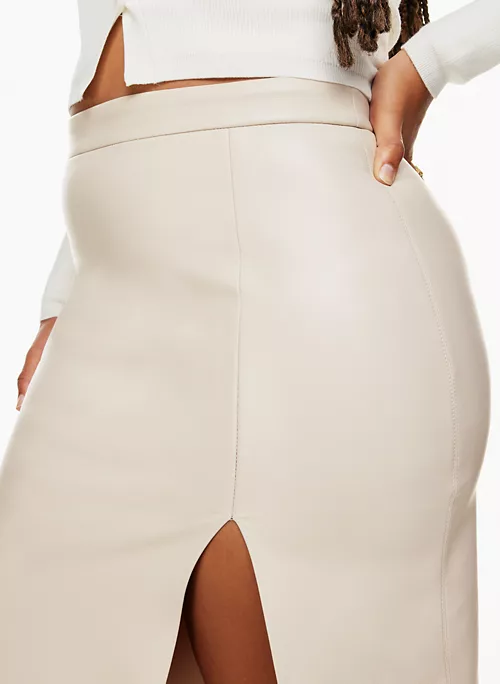 This is a high-waisted pencil skirt with a thigh slit. It’s made with our innovative Vegan Leather that looks and feels like the real thing.