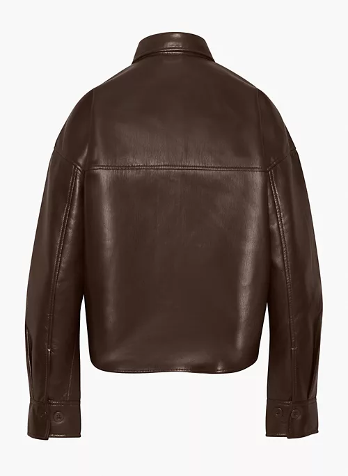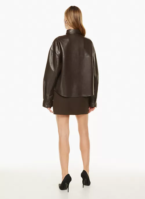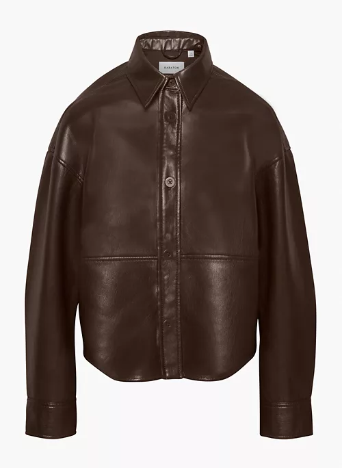 This is a collared button-up shirt jacket with dropped shoulders and a rounded hem. Itās made with our innovative Vegan Leather that looks and feels like the real thing.Ā