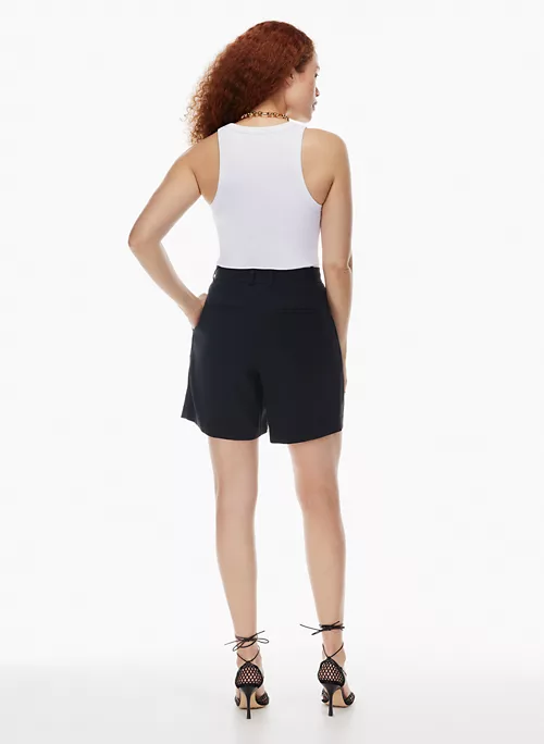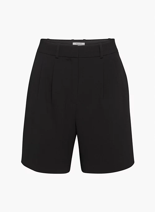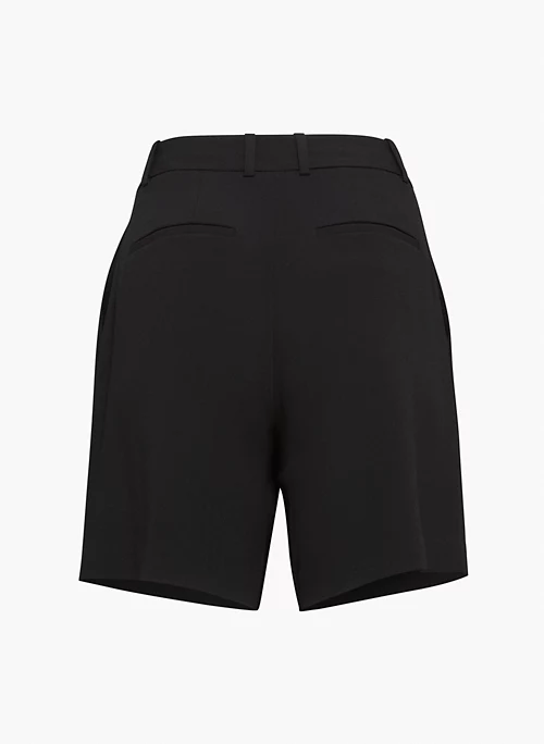 These are high-rise pleated shorts with slash hand pockets and darts at the back for shaping. They’re cut from TruCrepe ā Japanese fabric thatās matte-crepe on one side and satin on the other. Itās made with wood-based fibers from responsibly managed forests.
