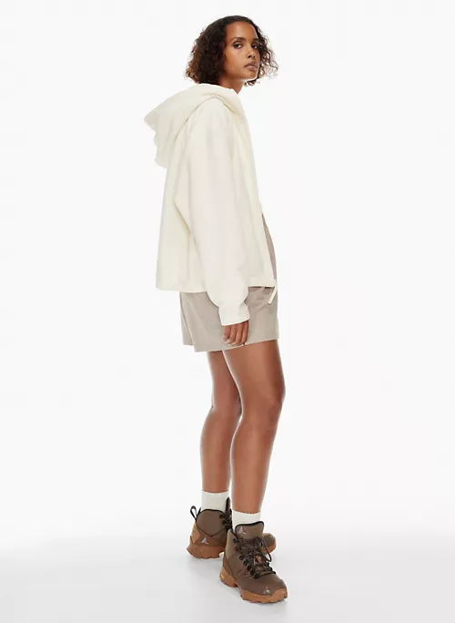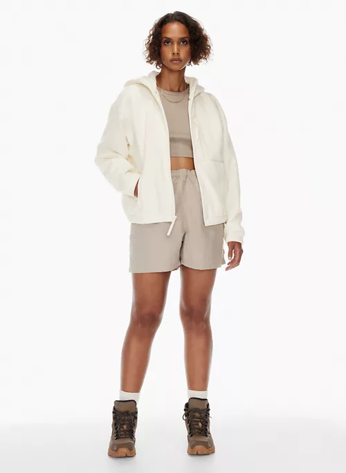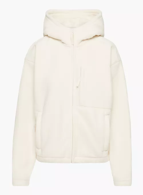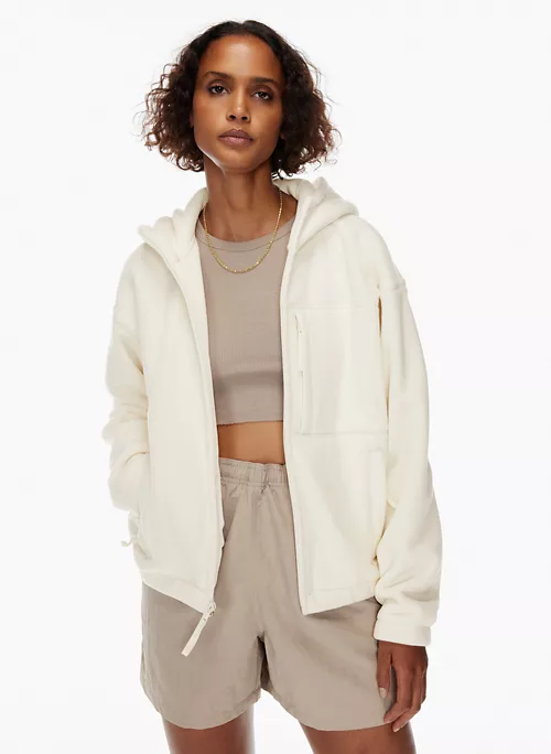 This is an oversized zip-up hoodie with dropped shoulders and a chest pocket. It’s made with Polartec® 200 — a breathable performance microfleece that gives you lightweight warmth with velour-like texture. This version is made from 100% recycled materials.