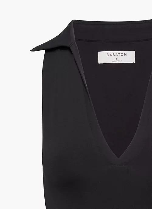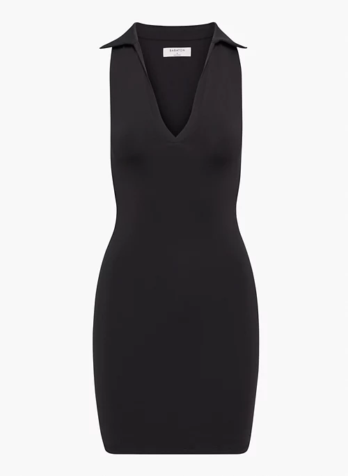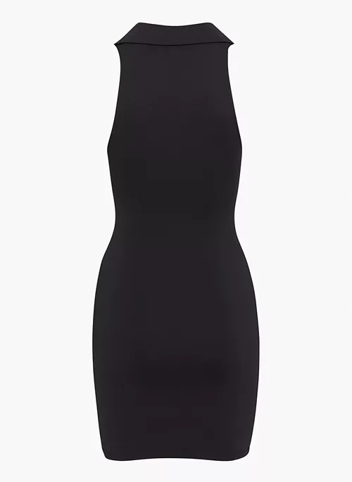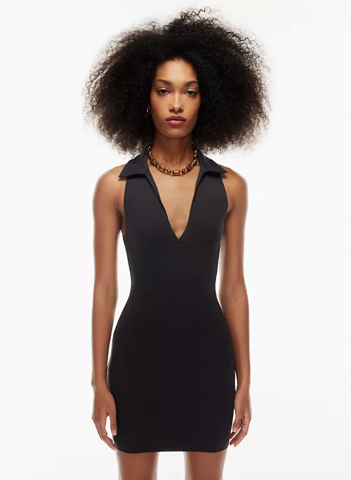 This is a polo mini dress with an open V neckline and doubled fabric for support. It’s made with Contour — a luxe, high-stretch fabric with a second-skin feel.