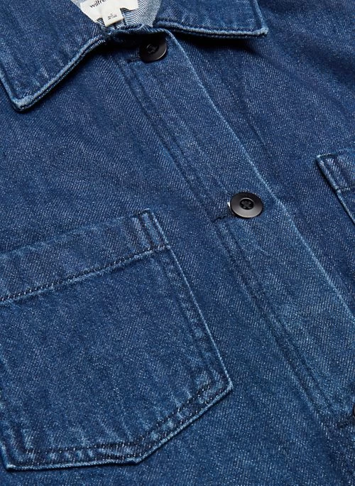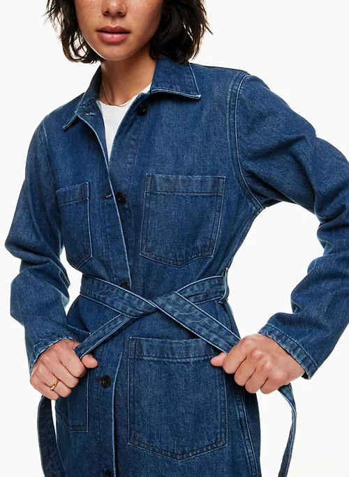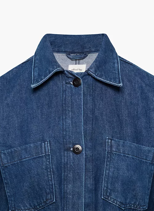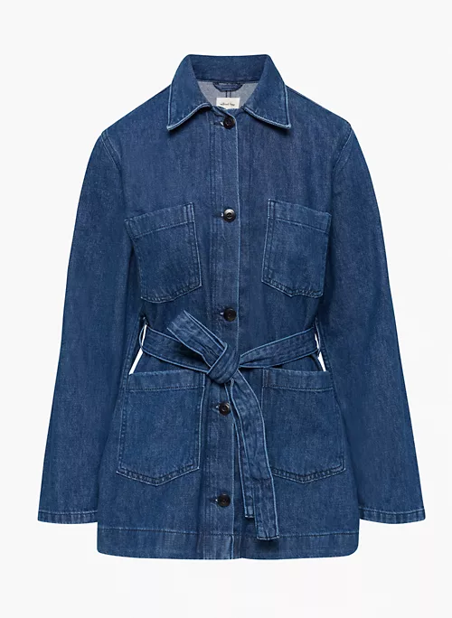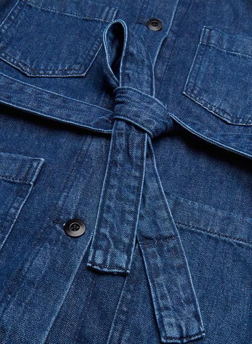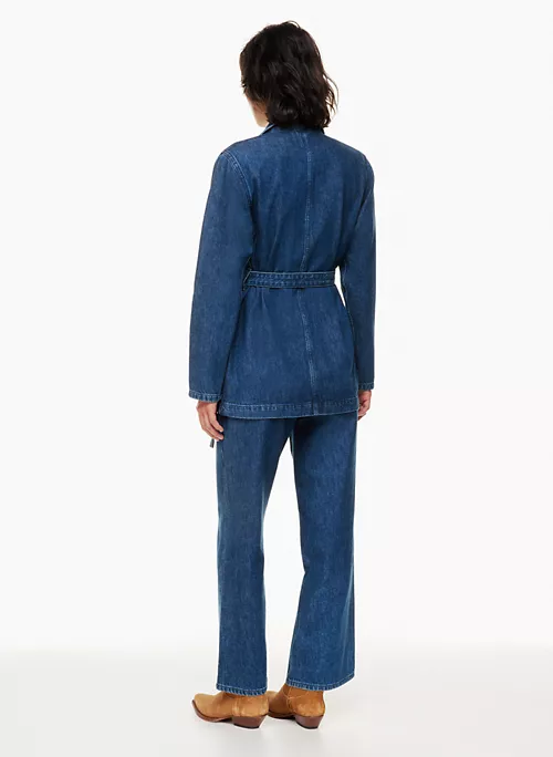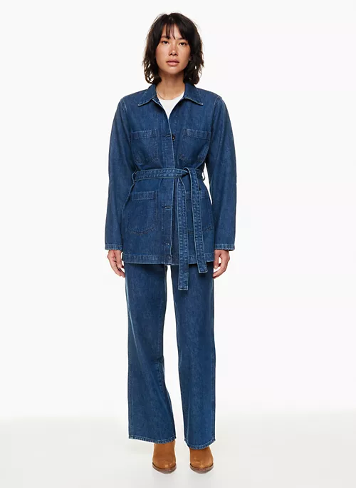 This is a button-up jacket with a removable belt and patch pockets. It’s cut from premium Italian denim. This version comes in a dark indigo wash.