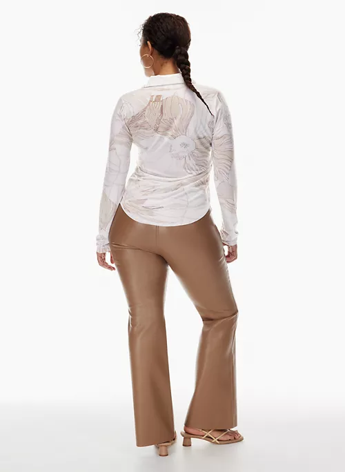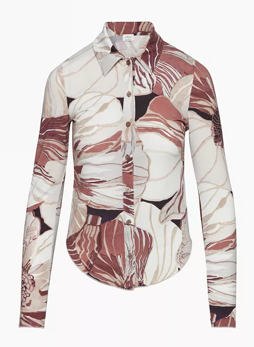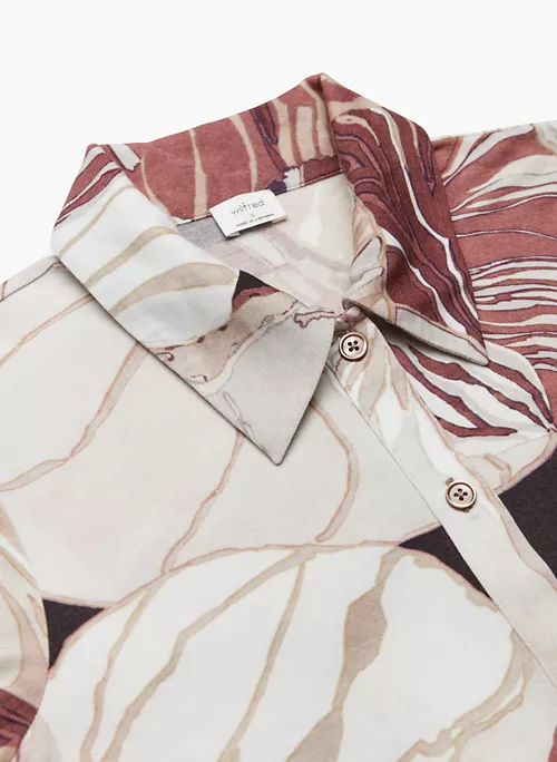 This is a collared button-up longsleeve with a rounded hem. It’s made with Relux Jersey, an ultra-soft and drapey fabric that uses TENCEL™ Lyocell — responsibly sourced wood-based fibres produced through a closed-loop system that reduces environmental impact. This version comes in a floral print that was designed in-house.
