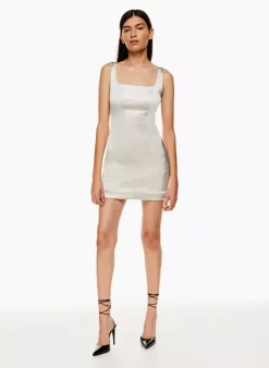 This is a bustier mini dress with a square neckline and visible seam lines. Itās made with stretchy high-shine satin.Ā