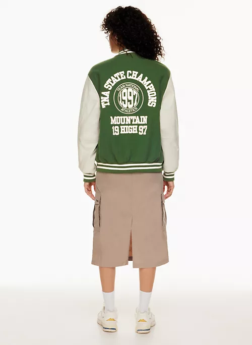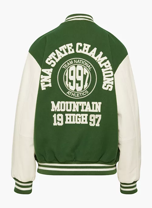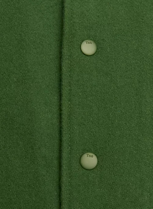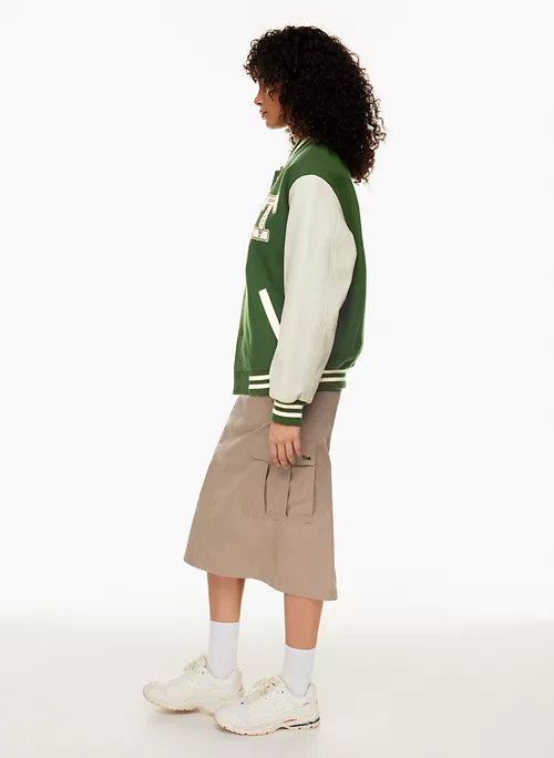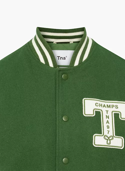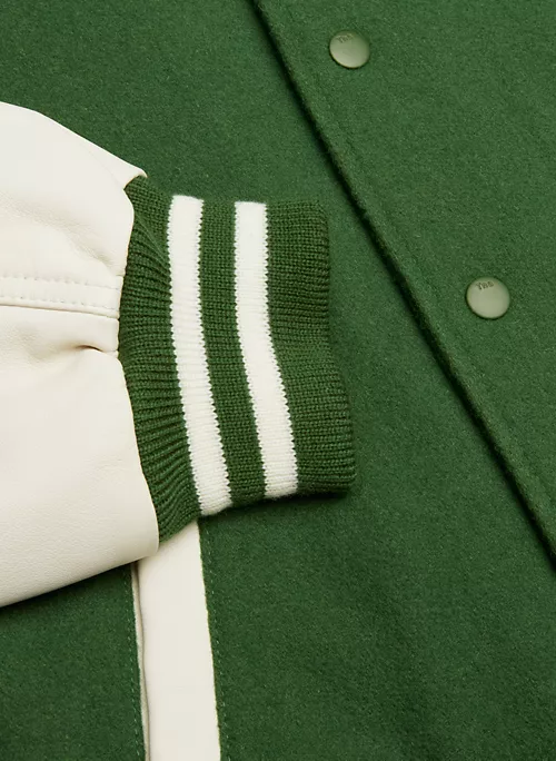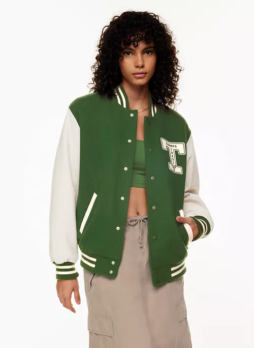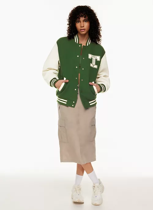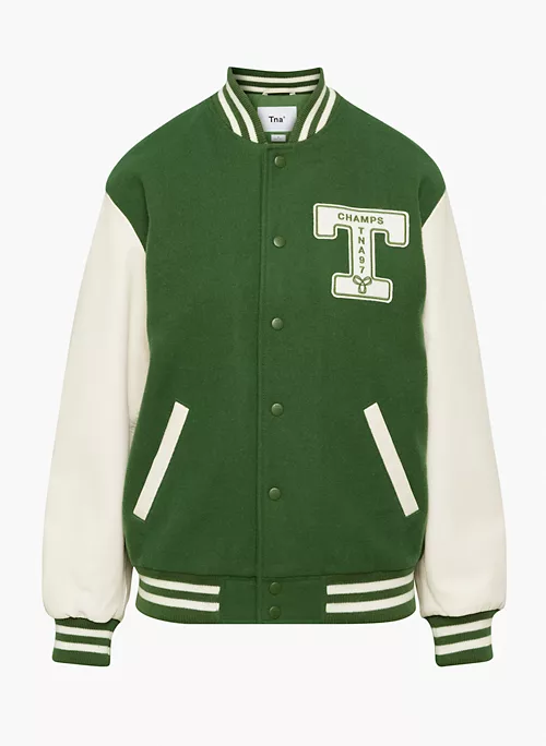 This is a relaxed bomber jacket with dropped shoulders, ribbed trim and genuine leather sleeves. It’s made with warm, felted wool that’s dense and textural. The body and sleeves are insulated with vegan fill for lightweight warmth without the bulk. This version features an exclusive varsity-inspired chenille patch graphic that was designed in-house.