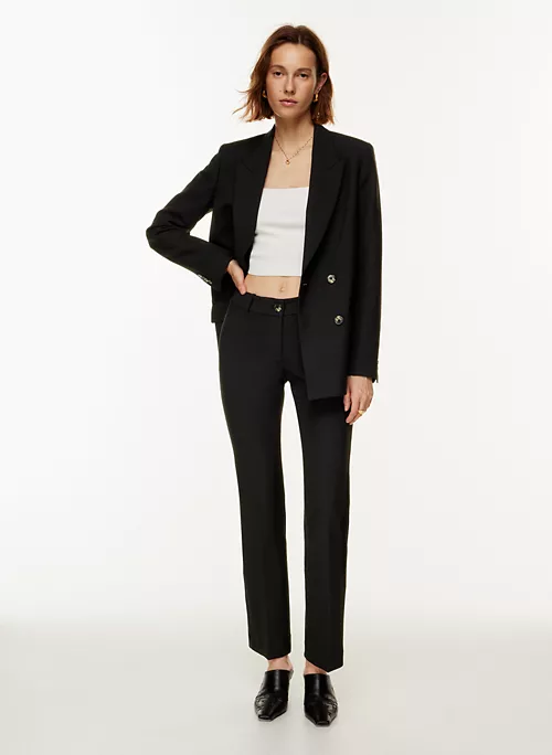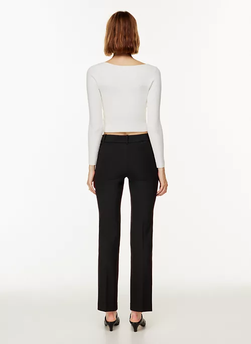 These are low-rise bootcut pants. They’re made with Hold Suiting ā lightly structured stretch suiting fabric made with recycled materials and Ā LENZING⢠ECOVERO⢠Viscose ā responsibly sourced wood-based fibres produced through a process that reduces impact on forests, biodiversity and water supply. Ā Ā