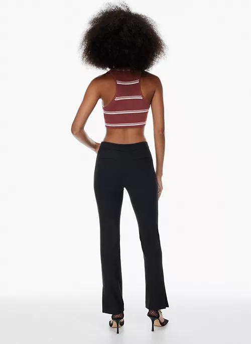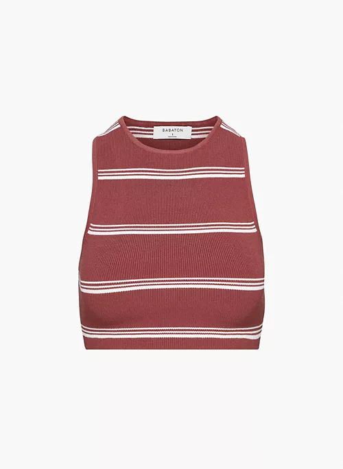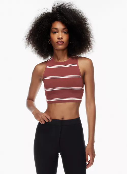 This is a fully fashioned cropped racerback tank. It’s made with Sculpt Knit — Babaton’s signature figure-smoothing yarn. The perfect amount of stretch hugs in the right places to shape and sculpt your form. It’s constructed using an Ottoman stitch with close distinct ribs for a structured and textural feel. This version comes in a yarn-dyed stripe pattern that’s been woven in, as opposed to printed on, for a more dimensional look.