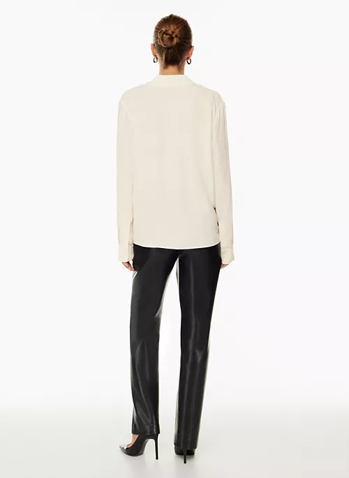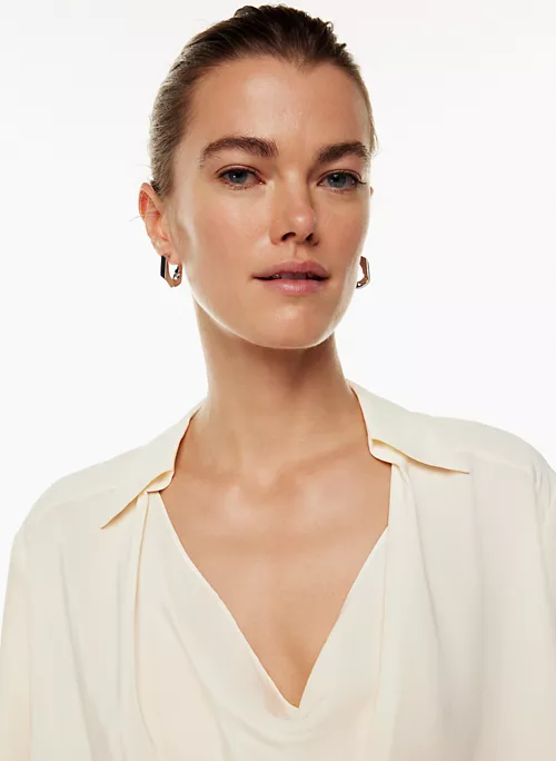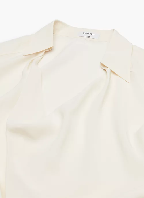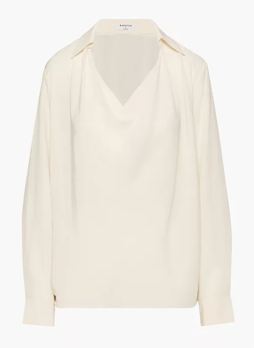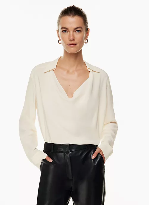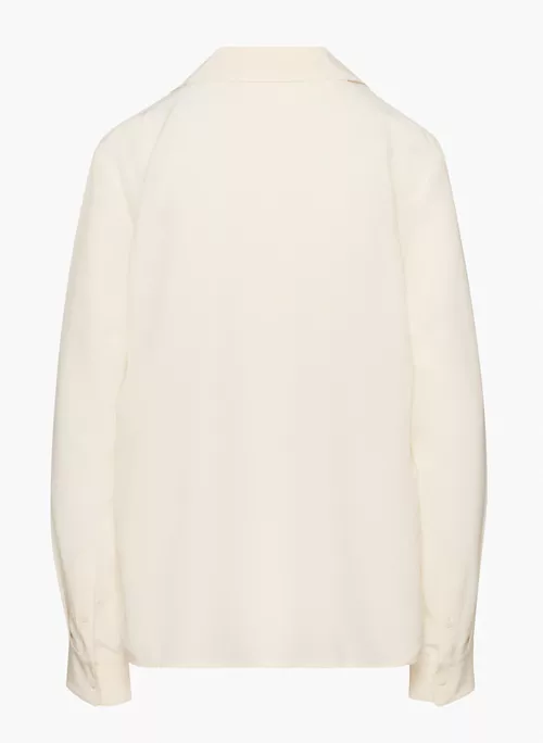 This is a long-sleeve blouse with an open-collar neckline and button-closure cuffs. It’s cut from luxurious, slightly textured matte crepe that’s made with silk.