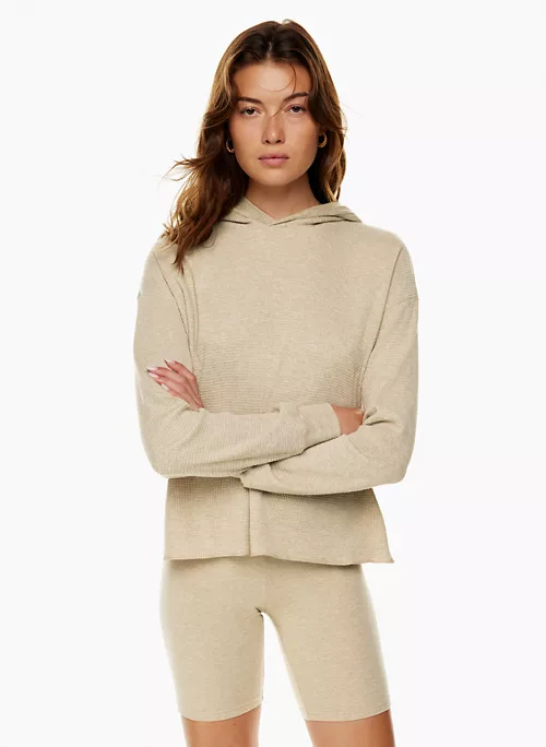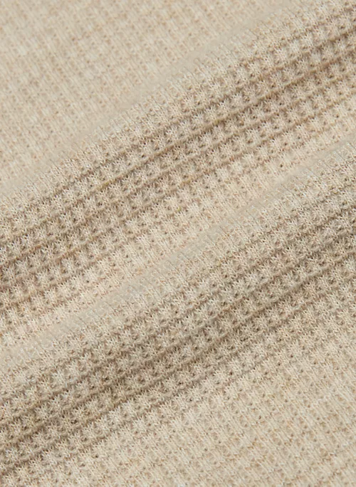 This is a hooded thermal longsleeve with ribbed cuffs. It’s made from cozy and textural waffle-knit fabric.