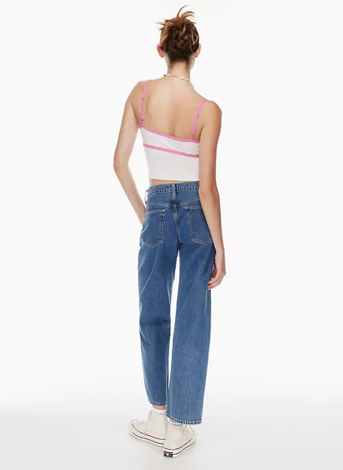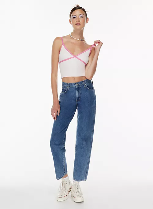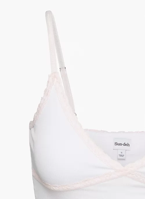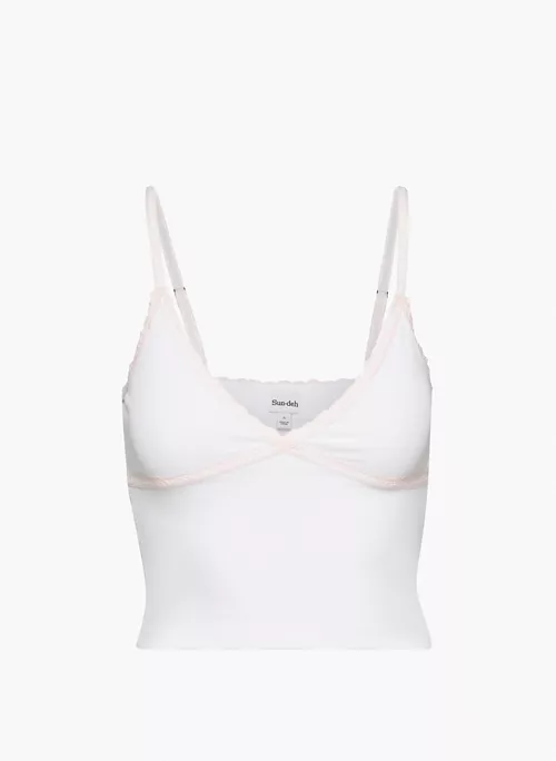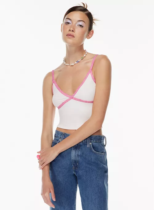 Flirt back. This is a v-neck tank with a lace trim and adjustable straps. Itās made with ReRIB, a soft and drapey ribbed fabric that uses TENCEL⢠Modal ā biodegradable fibres sourced mainly from natural beech wood and produced through an environmentally low-impact process.
