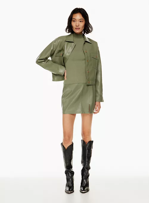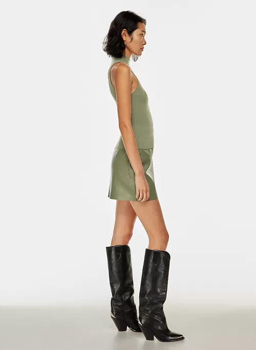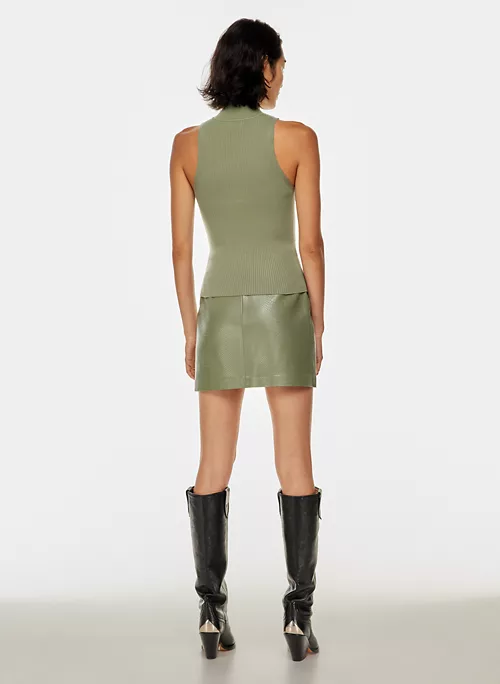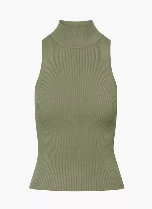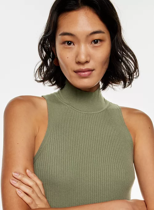 This is a mock-neck sweater tank with fully fashioned construction. It’s knit with Wonder Yarn ā the lightweight yarn that lives up to its name. This peachy-soft yarn offers the all-season warmth of wool, without the wool. Itās made with LENZING⢠ECOVERO⢠Viscose ā responsibly sourced wood-based fibres produced through a process that reduces impact on forests, biodiversity and water supply. This version is constructed using a Wide Rib stitch with distinct columns for comfortable widthwise stretch.