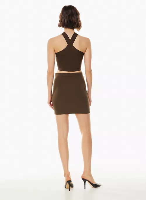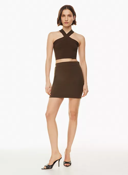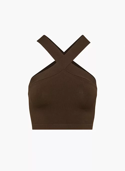 This is a fully fashioned halter top with a cross-front neckline and body-hugging fit. Itās made with Sculpt Knit ā Babatonās signature figure-smoothing yarn. The perfect amount of stretch hugs in the right places to shape and sculpt your form. This version is constructed with a Jersey stitch for a soft drape and a smooth, flat feel.Ā