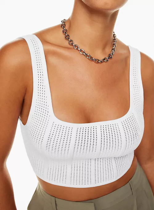 Guess you’re into feeling smooth and sculpted or something. This is a fully fashioned cropped tank with a double square neckline. It’s made with Sculpt Knit — Babaton’s signature figure-smoothing yarn. The perfect amount of stretch hugs in the right places to shape and sculpt your form. This version is constructed using a Mesh stitch with an open knit pattern for an airy feel.
