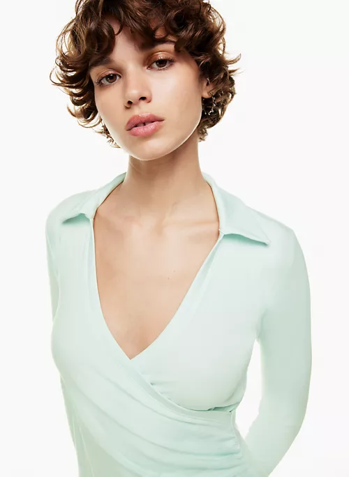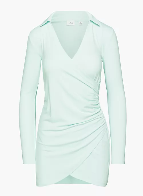 This is a collared mini dress with a faux wrap and gathered side. Itās made with Relux Jersey, an ultra-soft and drapey fabric that uses LENZING⢠ECOVERO⢠Viscose ā responsibly sourced wood-based fibres produced through a process that reduces impact on forests, biodiversity and water supply.