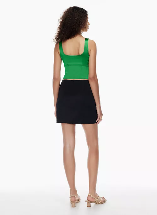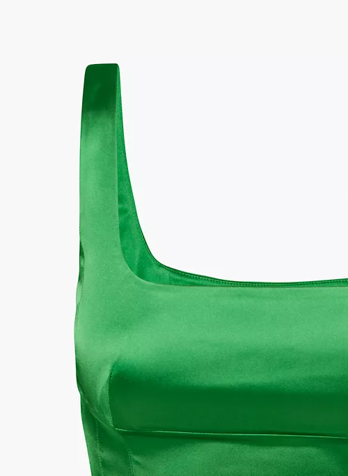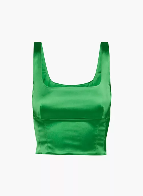 This is a slightly cropped, square-neck bustier with darts and princess seams for shaping. Itās made with high-shine stretch satin.