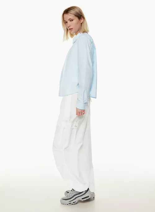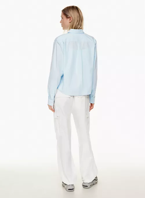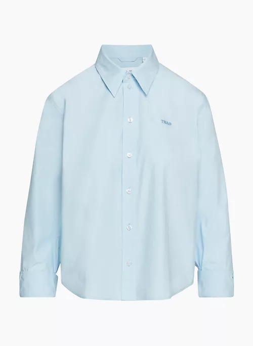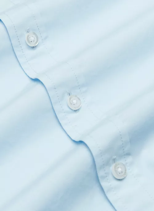 This is a classic button-up shirt with a flattering rounded hem. It’s made with lightweight and crisp cotton poplin that’s smooth to the touch.