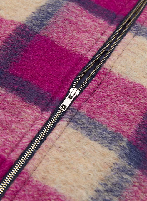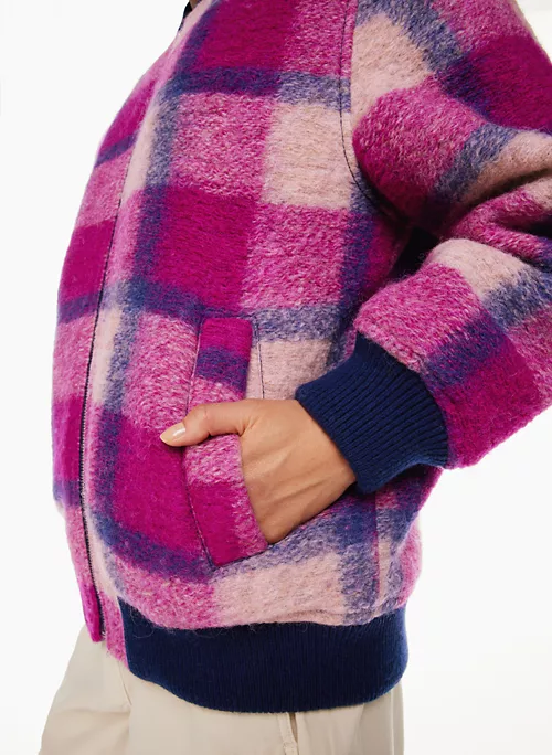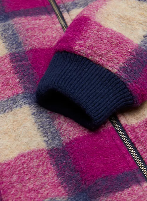 This is an insulated bomber jacket with dropped shoulders, a quilted interior lining and welt hand pockets with snap closures. It’s made with warm, luxurious felted wool from Italy. This version features a yarn-dyed plaid pattern that was woven in, as opposed to printed on, for a more dimensional look.