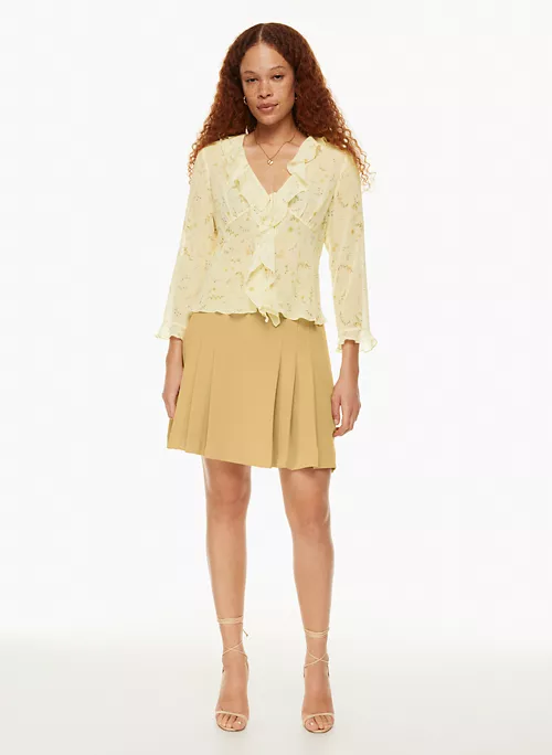 This is a high-waisted pleated skirt with an invisible zipper. It’s made from Crepette — Wilfred’s iconic crepe fabric famous for its subtle texture and breezy, effortless drape. It’s sourced from a premier Japanese mill.