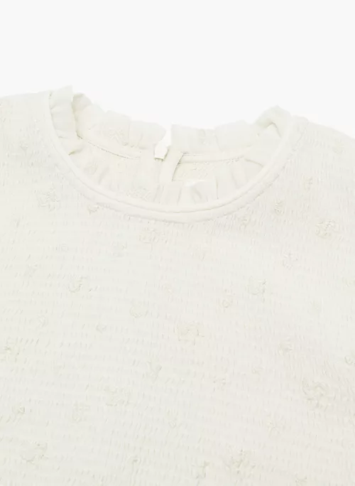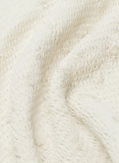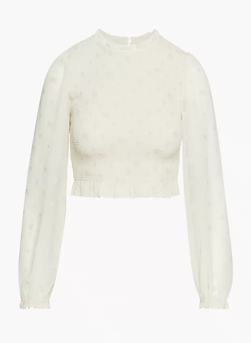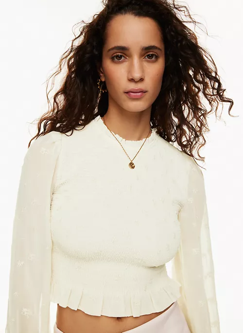 This is a smocked blouse with sheer puff sleeves and a ruffle trim. It’s cut from Fête Chiffon — lightweight, semi-sheer fabric with an ethereal drape that’s made from 100% recycled materials. This version features an exclusive embroidered floral motif designed in-house.