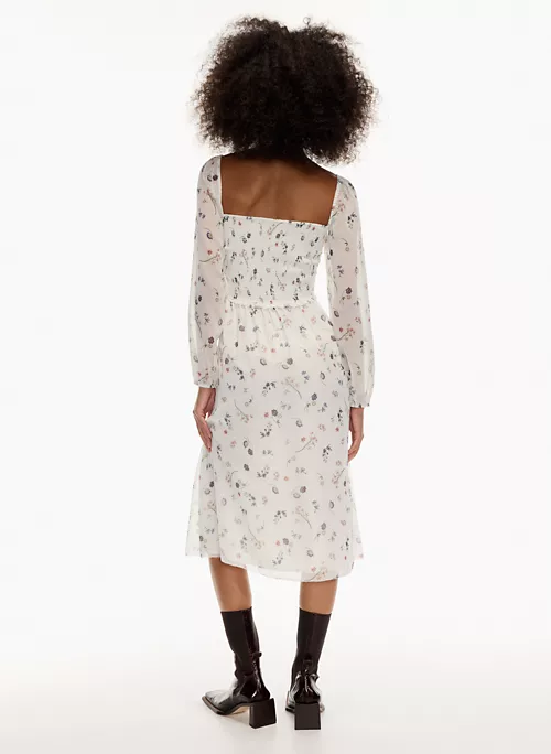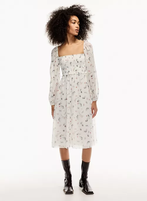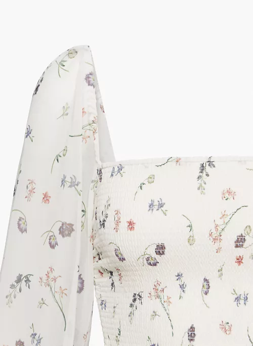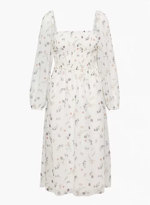 This is a square-neck midi dress with a smocked bodice, gathered skirt and puff sleeves. Itās made with lightweight, semi-sheer chiffon. This version comes printed with a tossed floral motif that was painted by hand.